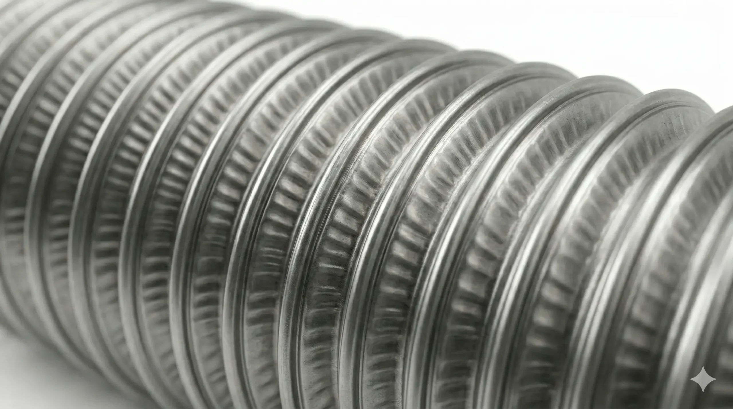 Flexible metal duct is formed from interlocking spiral-wound metal strip that provides full flexibility while maintaining structural integrity under high-temperature conditions. The interlocking construction allows angular deflection up to 90° and accommodates vibration and thermal expansion without stress on joints. Stainless steel grade is used for exhaust temperatures up to 550°C.
