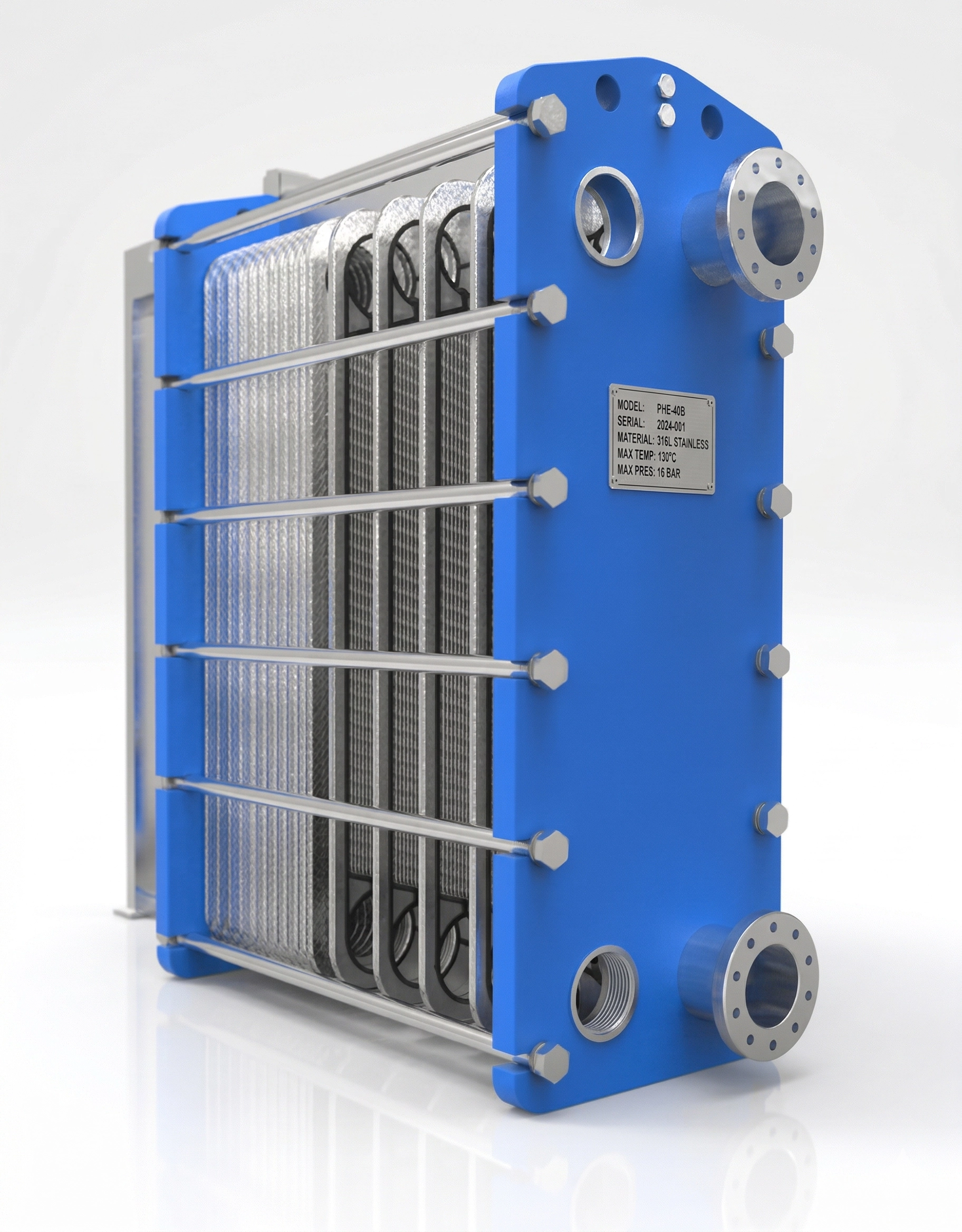 Gasketed plate heat exchangers (PHE) transfer thermal energy between two fluid streams through a series of corrugated stainless steel plates clamped between a frame and a pressure plate. The corrugated chevron pattern creates high turbulence at low flow velocity, achieving heat transfer coefficients 3–5× higher than shell-and-tube exchangers of equivalent duty. Plates are fully accessible by loosening the tie bolts, enabling cleaning, inspection, and capacity adjustment by adding or removing plate pairs without pipe disconnection.