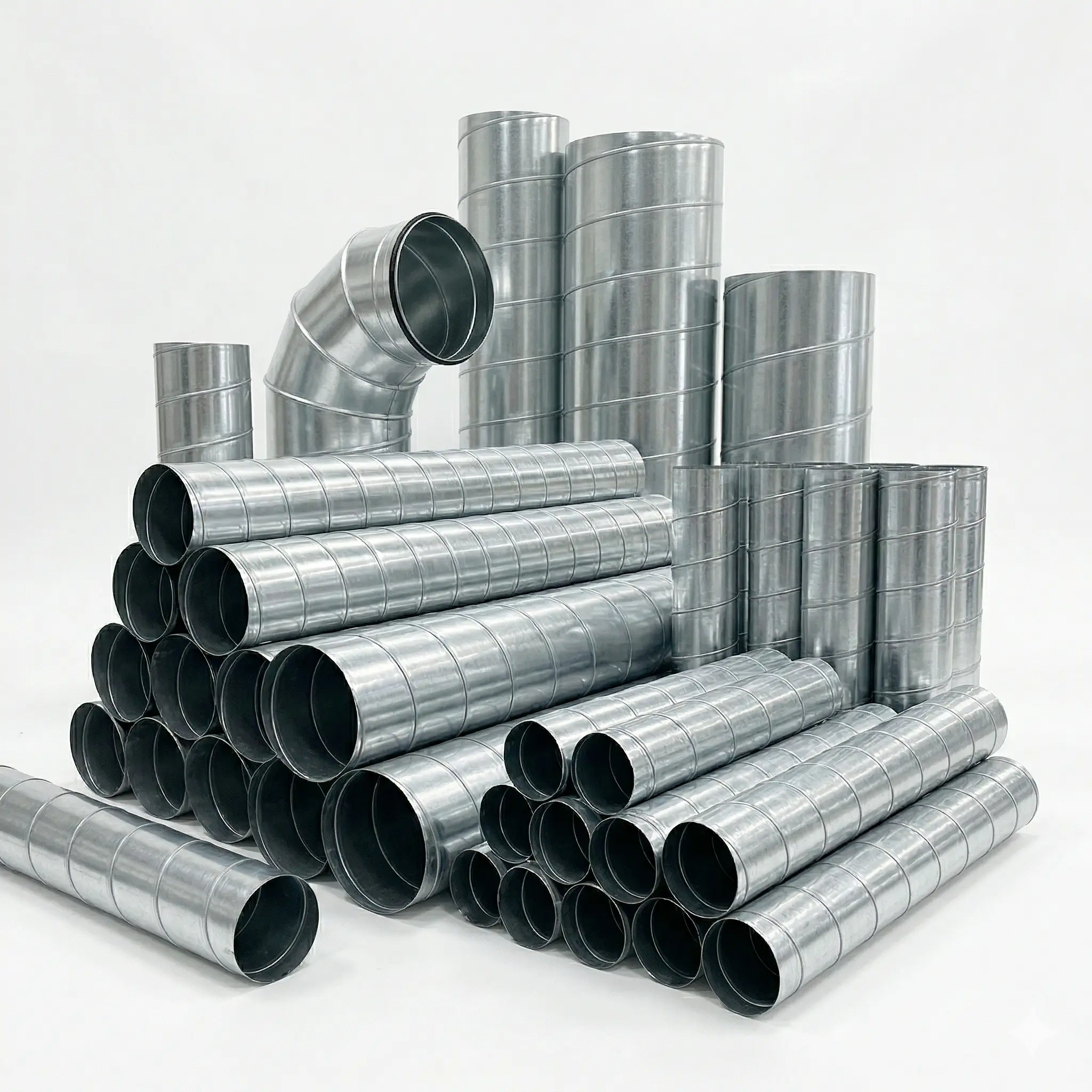 Spiral round duct is fabricated using a continuous helical lock-seam process from hot-dip galvanized steel coil. The spiral seam provides superior rigidity and airtightness compared to longitudinal-seam duct, with leakage rates typically below 1%. Used extensively in commercial HVAC, industrial ventilation, and exhaust systems where smooth airflow and long straight runs are required.